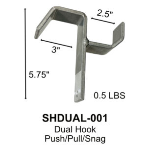Este gancho puede aceptar objetos de hasta 2.5 pulgadas de diámetro en su agarre. El extremo plano del gancho es muy útil para empujar. Utiliza este accesorio con un Sling-Stik o Talon para tomar, enganchar y tirar, así como para sujetar, enganchar y empujar objetos como aparejos, tuberías, tubos y muchos otros elementos. El accesorio está cortado con láser y doblado en aluminio 6061, lo que lo hace liviano y resistente. Material: Aluminio de 1/4" de espesor Peso del accesorio: 0.7 libras Dimensiones de envío: 7 x 6 x 6 – 1 libra
